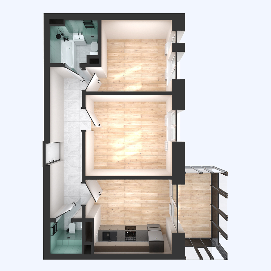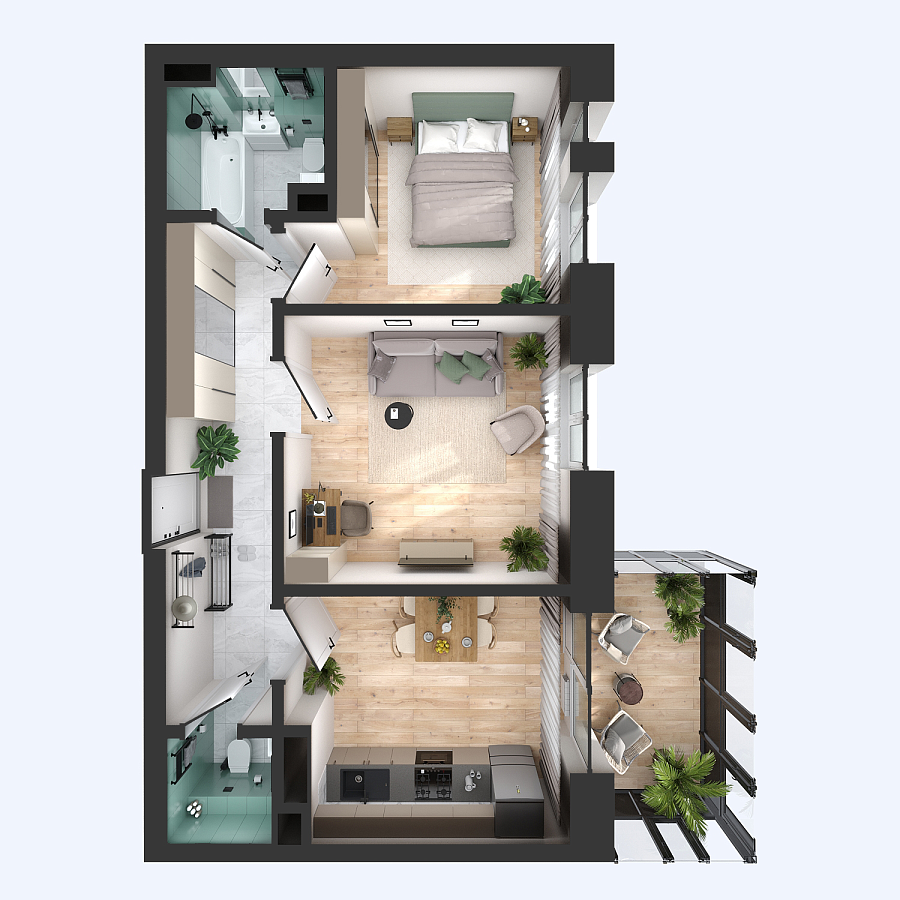 Визуализация и планировка, в том числе в части площади и размера стен жилого помещения, используемых цветовых решений на плане являются проектными и могут быть изменены в ходе строительства объекта. Цена квартиры зависит от выбранной программы и акции, актуальные цены можно уточнить у менеджеров и на момент заключения договора.
