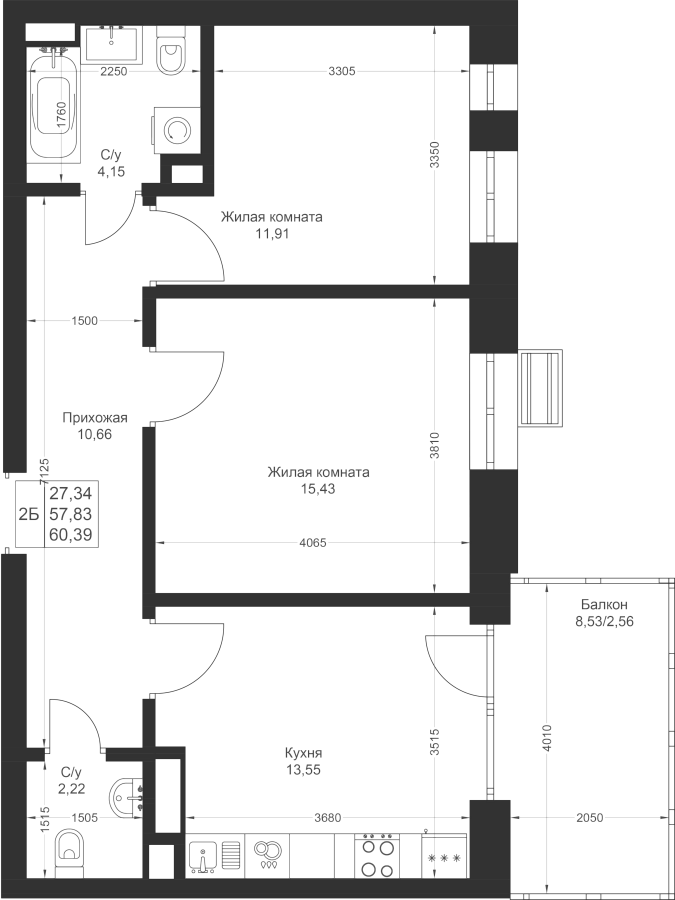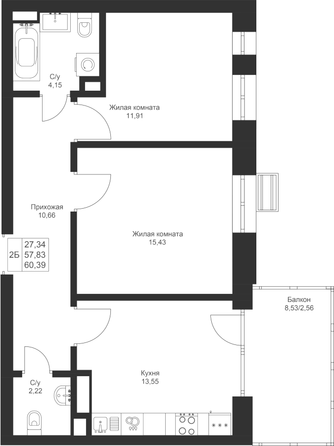 2-к квартира 60.39 м²