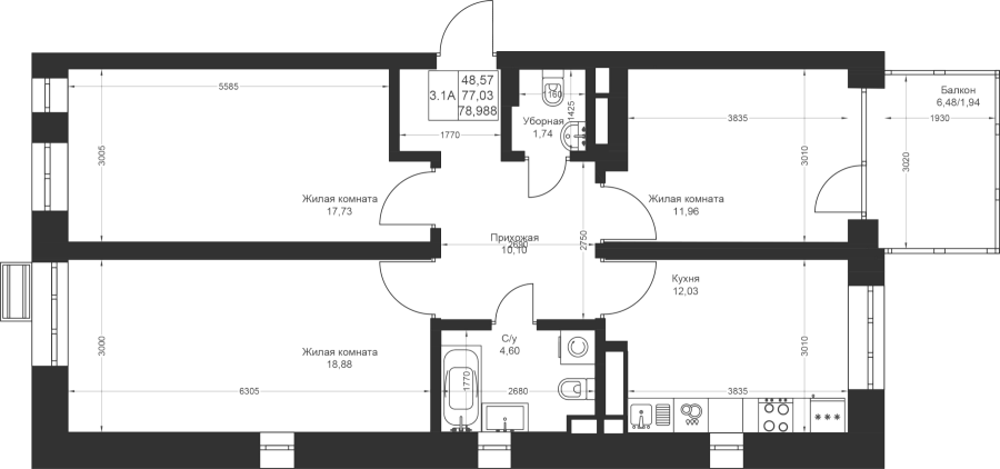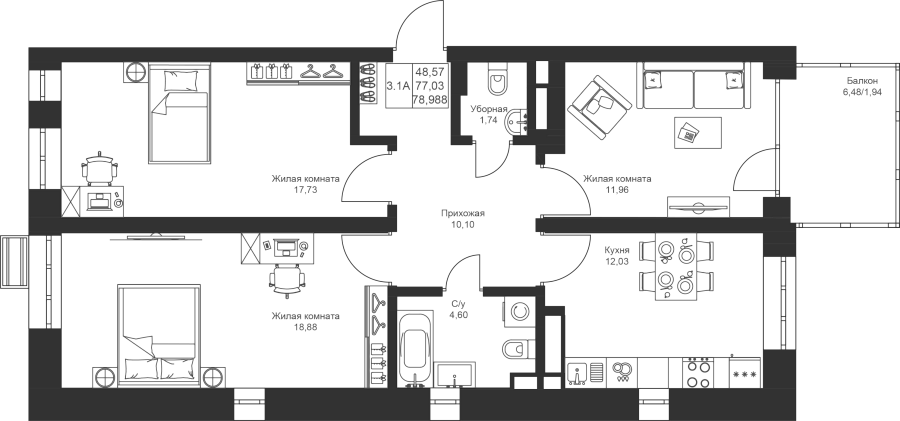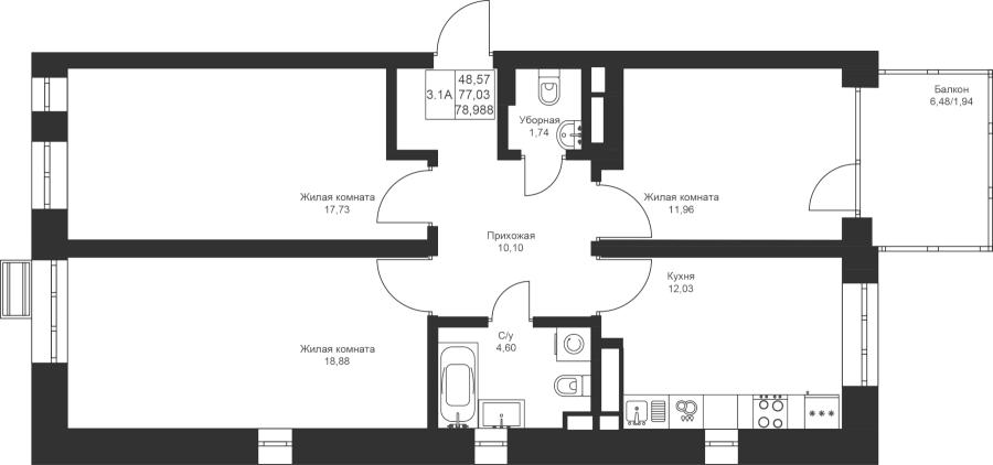3-к квартира 78.98 м²