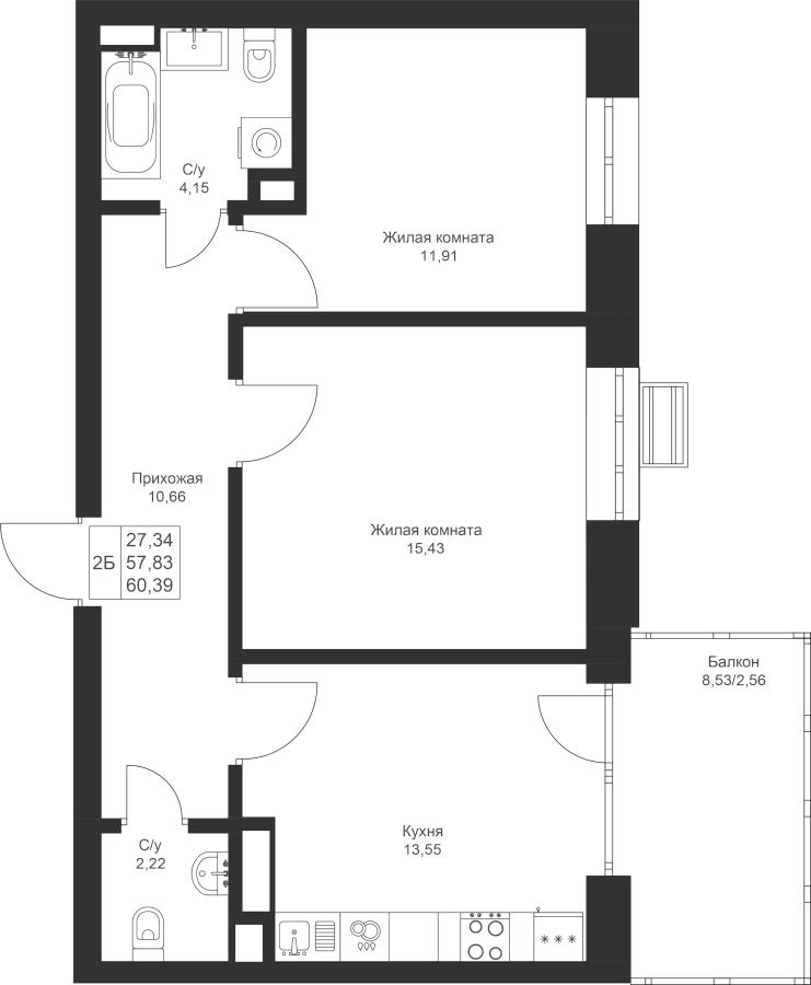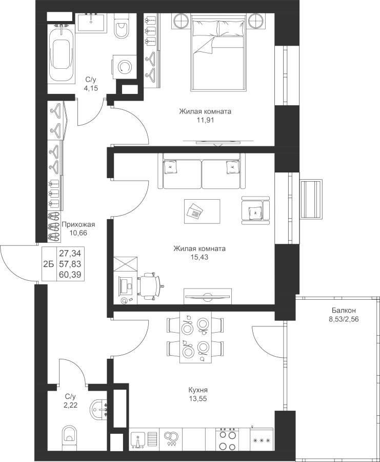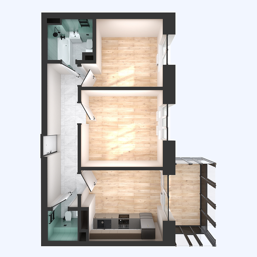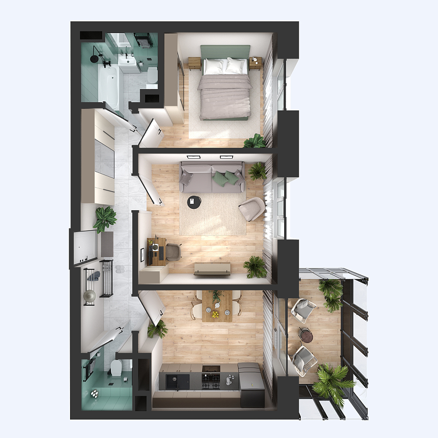 Визуализация и планировка, в том числе в части площади и размера стен жилого помещения, используемых цветовых решений на плане являются проектными и могут быть изменены в ходе строительства объекта. Цена квартиры зависит от выбранной программы и акции, актуальные цены можно уточнить у менеджеров и на момент заключения договора.