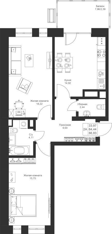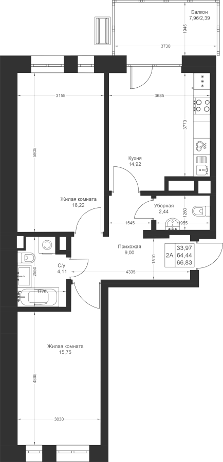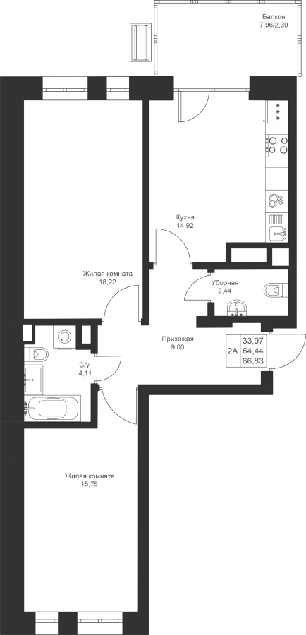 2-к квартира 66.83 м²
