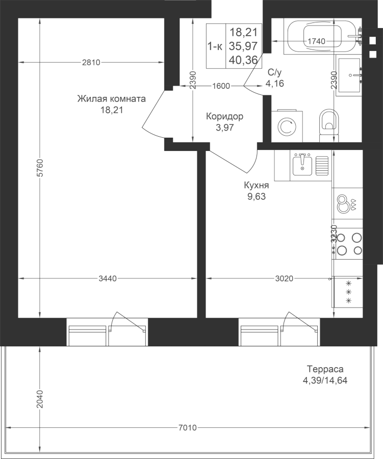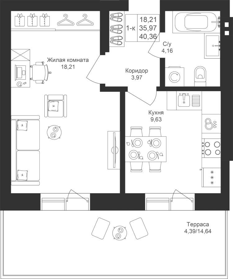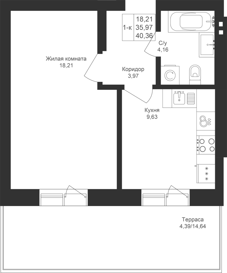 1-к квартира 40.36 м²