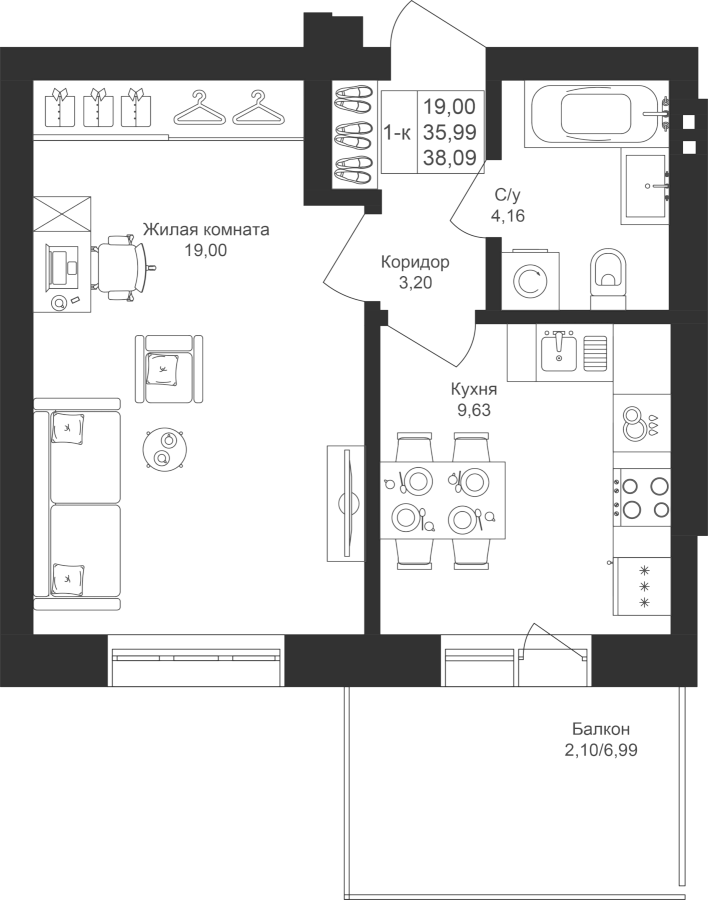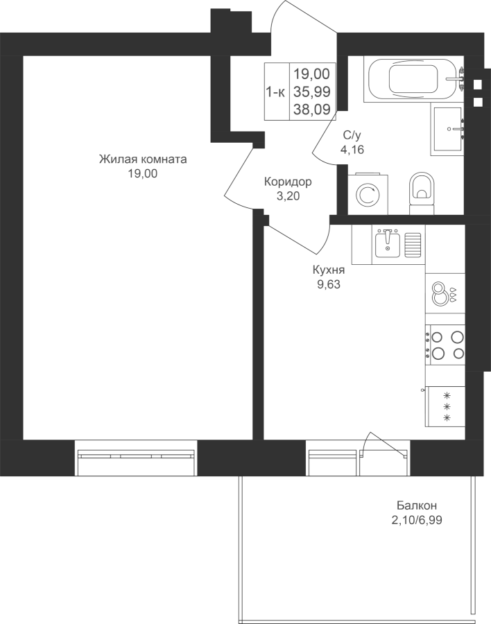 1-к квартира 38.09 м²