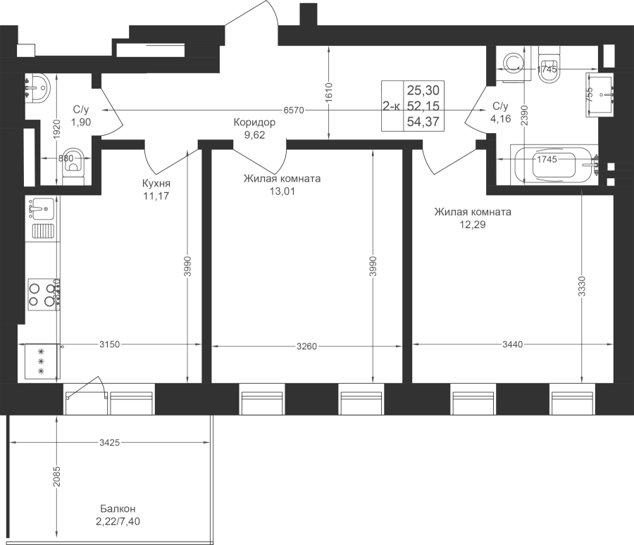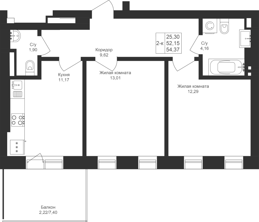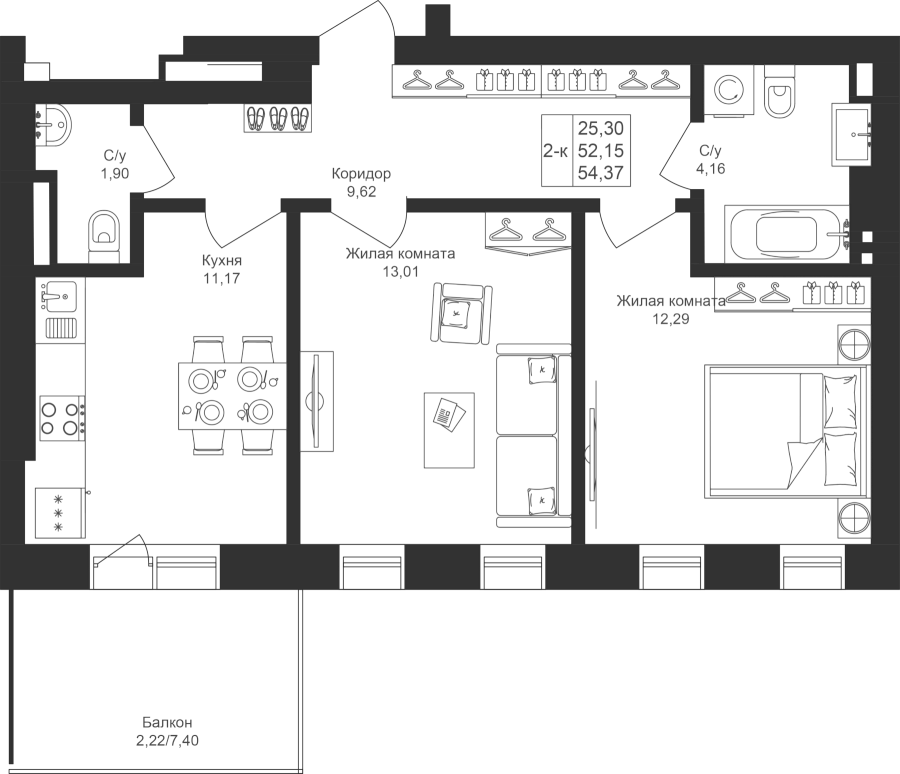 2-к квартира 54.37 м²