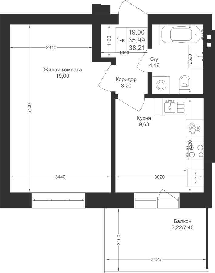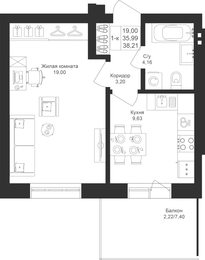 1-к квартира 38.21 м²