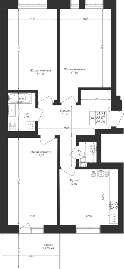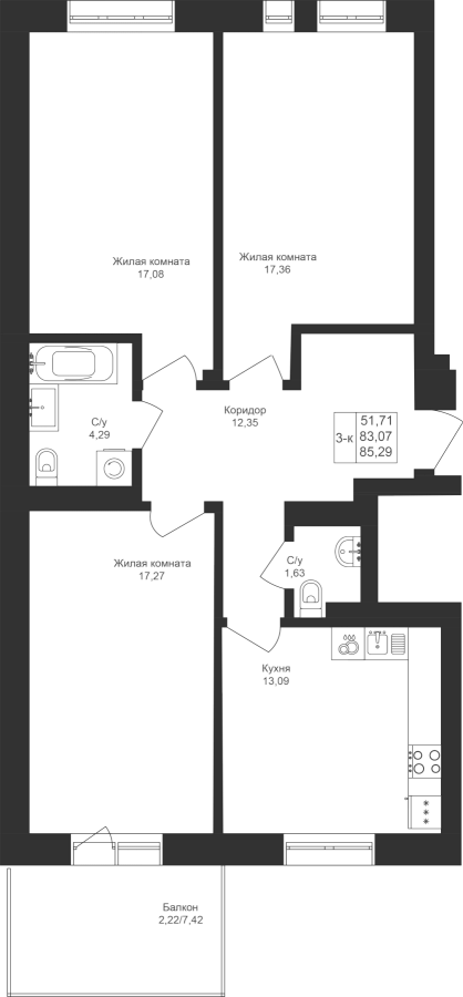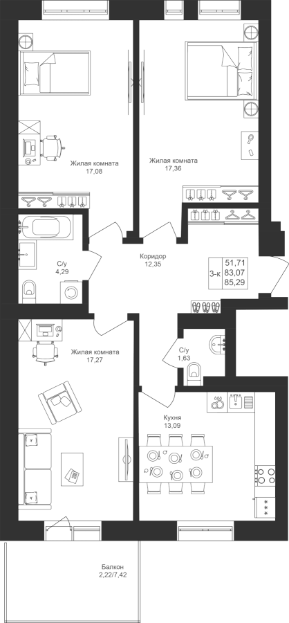 Визуализация и планировка, в том числе в части площади и размера стен жилого помещения, являются проектными и могут быть изменены в ходе строительства объекта. Цена квартиры зависит от выбранной программы и акции, актуальные цены можно уточнить у менеджеров и на момент заключения договора.