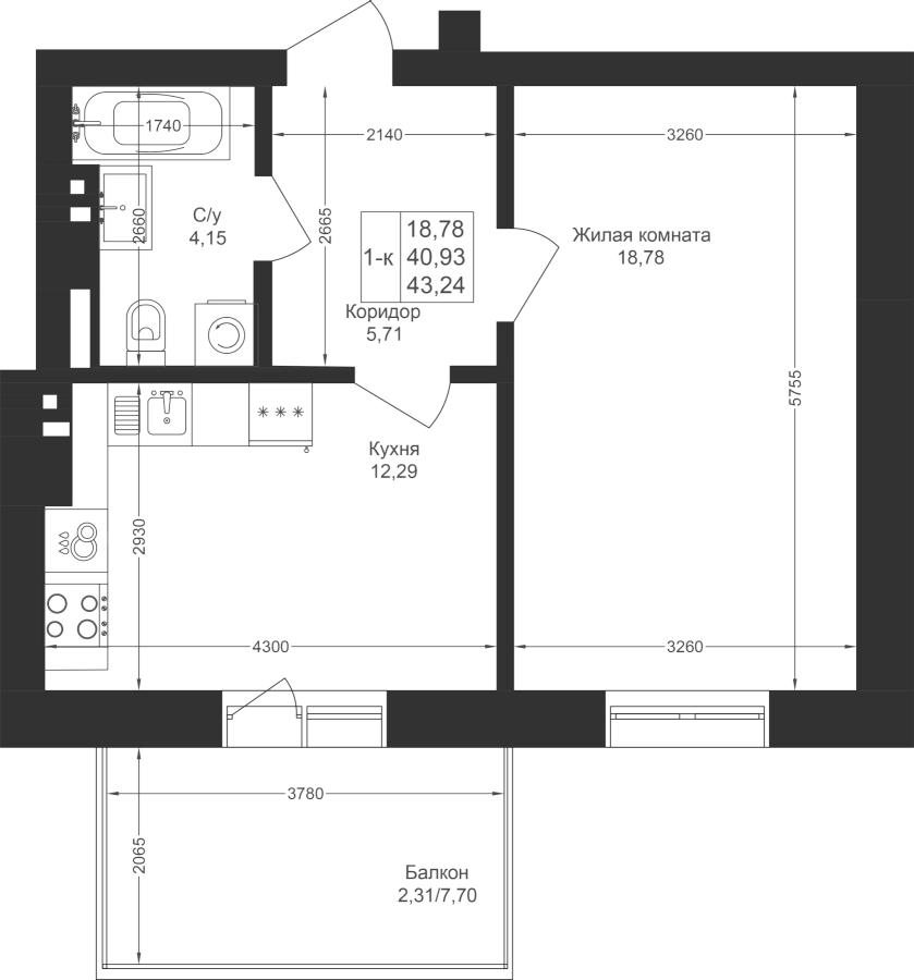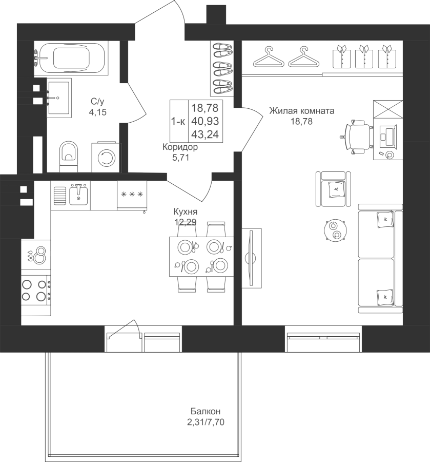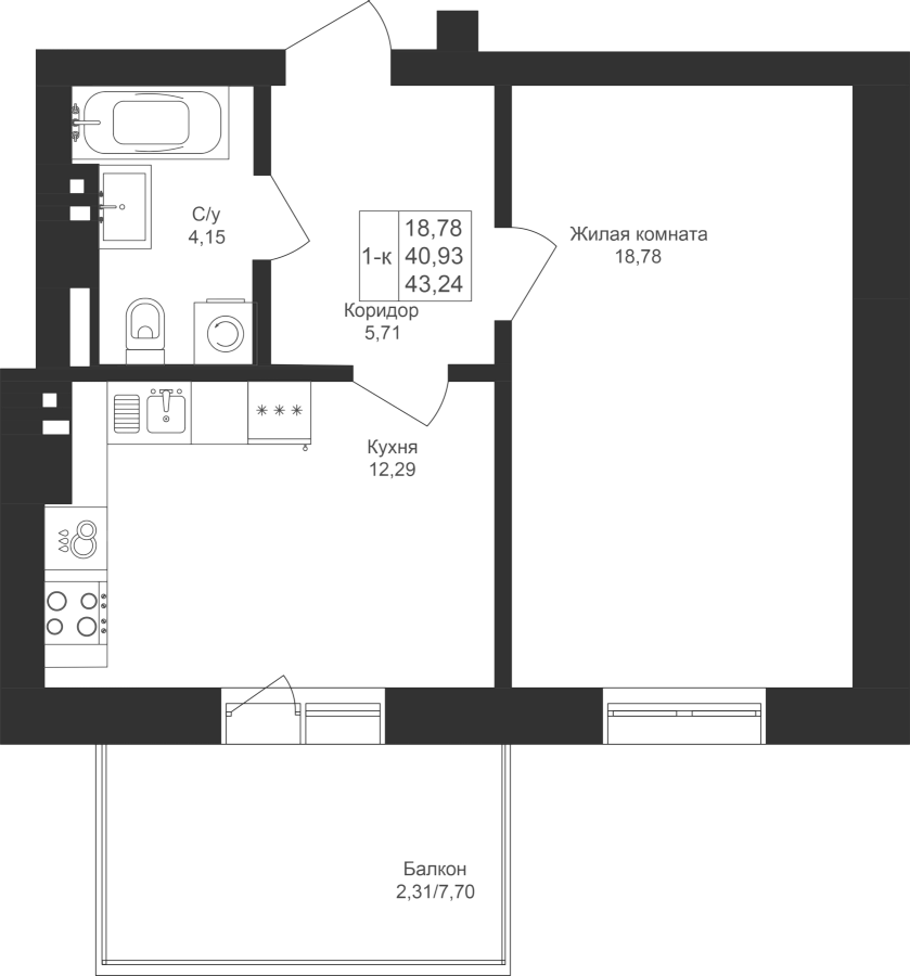 1-к квартира 43.24 м²
