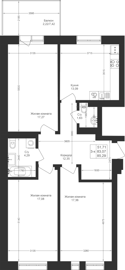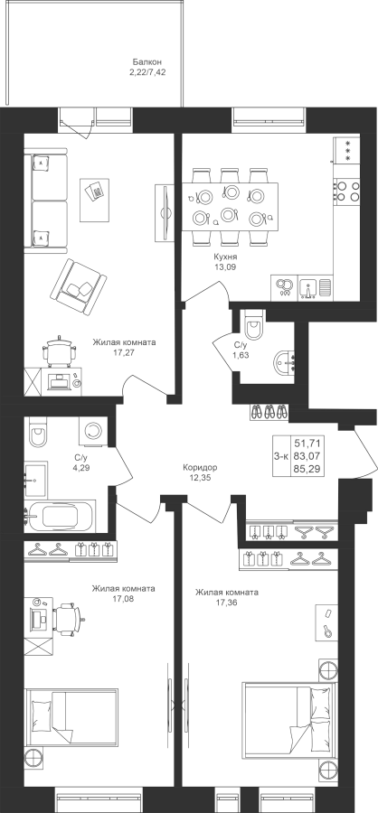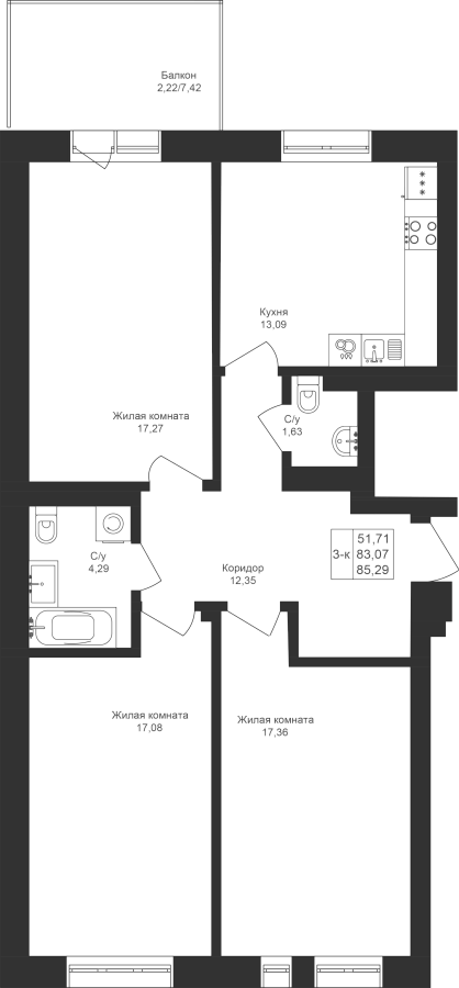 Визуализация и планировка, в том числе в части площади и размера стен жилого помещения, являются проектными и могут быть изменены в ходе строительства объекта. Цена квартиры зависит от выбранной программы и акции, актуальные цены можно уточнить у менеджеров и на момент заключения договора.