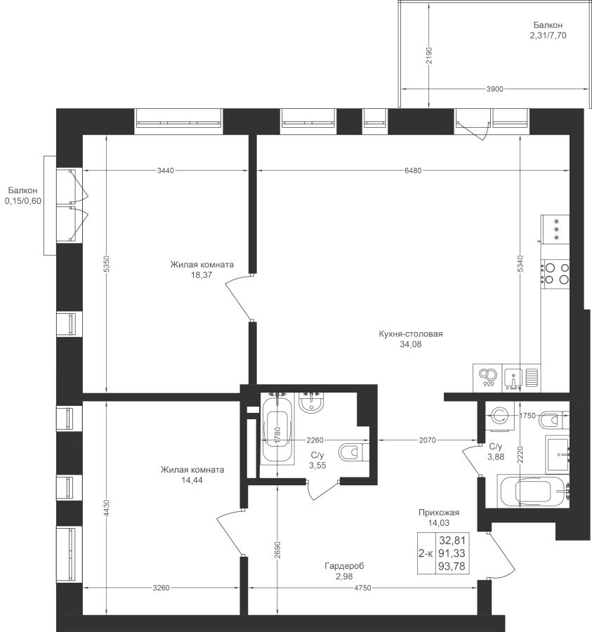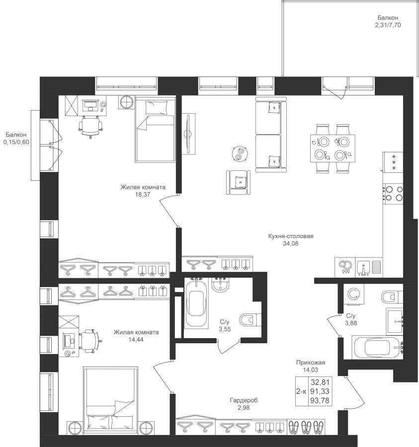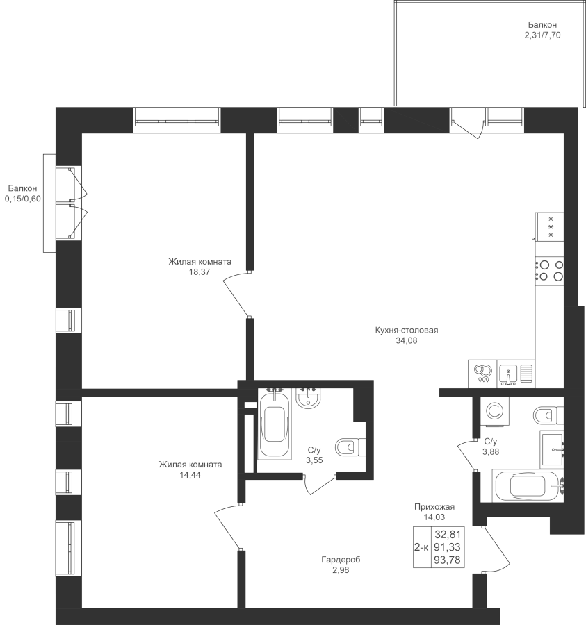 2-к квартира 93.79 м²
