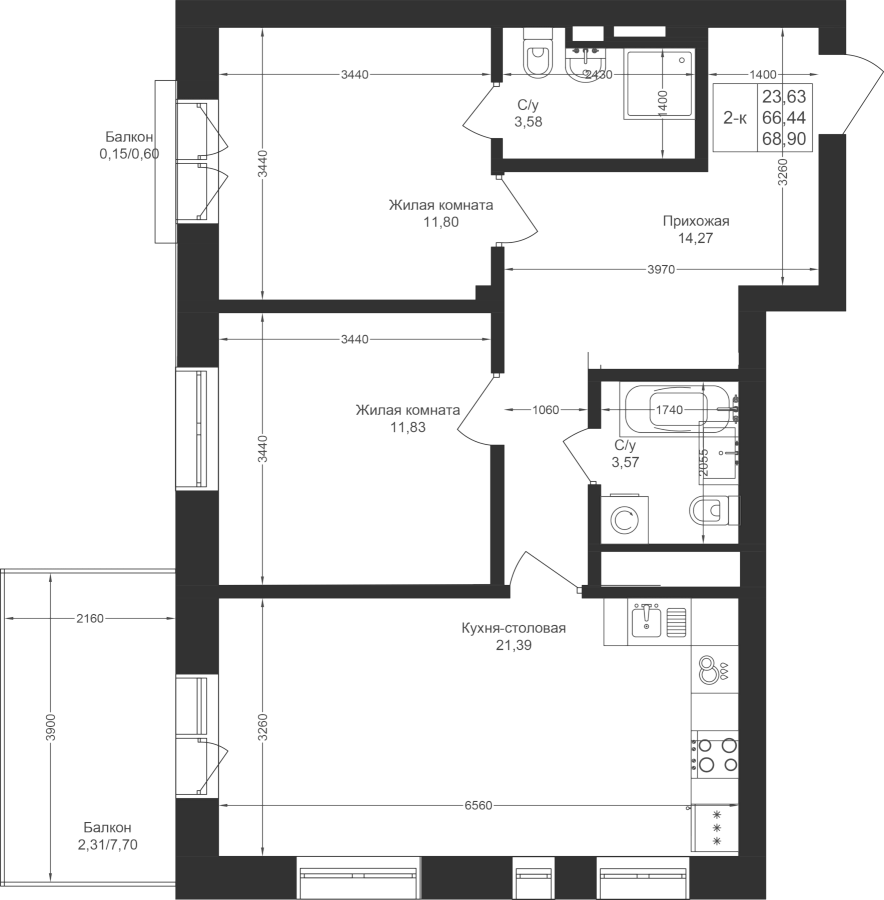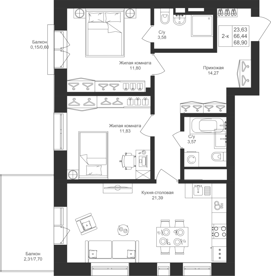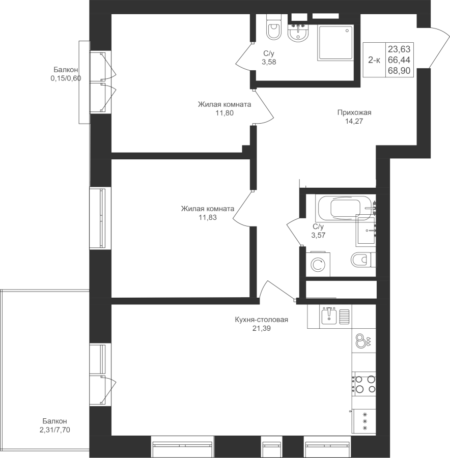 2-к квартира 68.9 м²