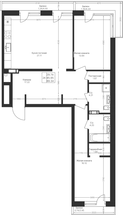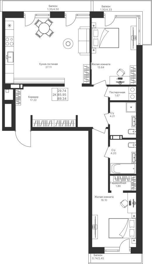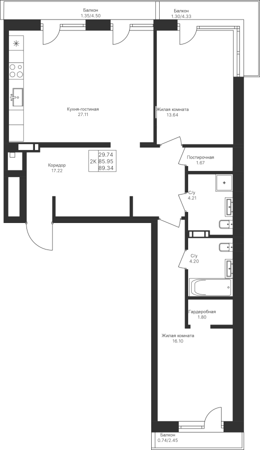 Визуализация и планировка, в том числе в части площади и размера стен жилого помещения, являются проектными и могут быть изменены в ходе строительства объекта. Цена квартиры зависит от выбранной программы и акции, актуальные цены можно уточнить у менеджеров и на момент заключения договора.