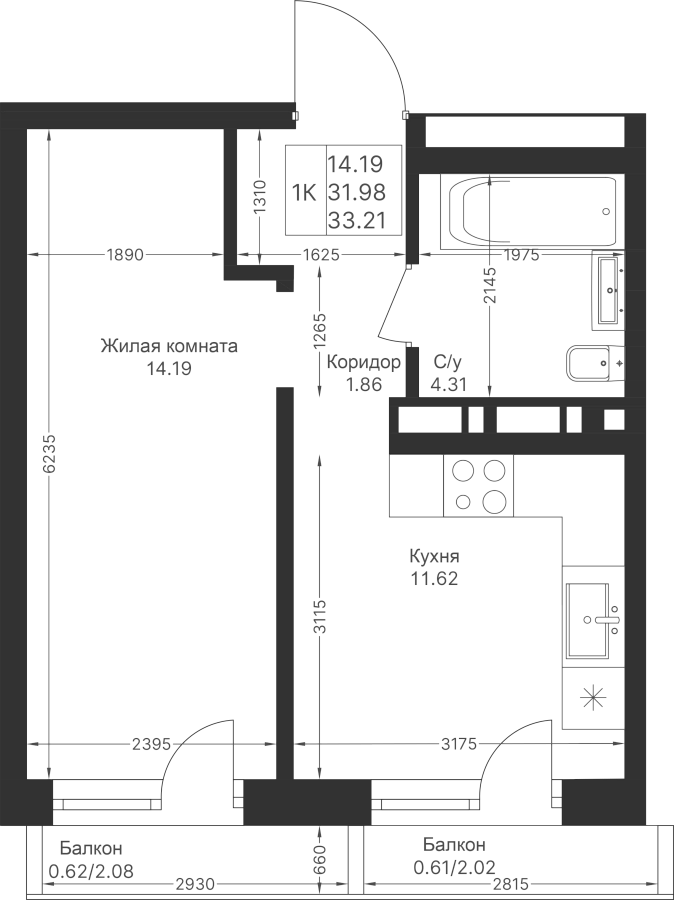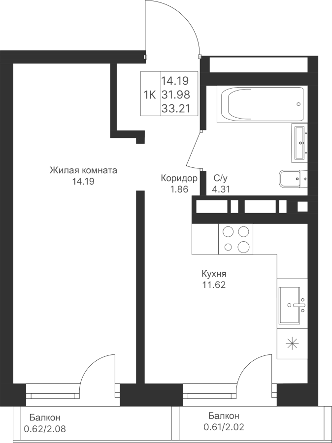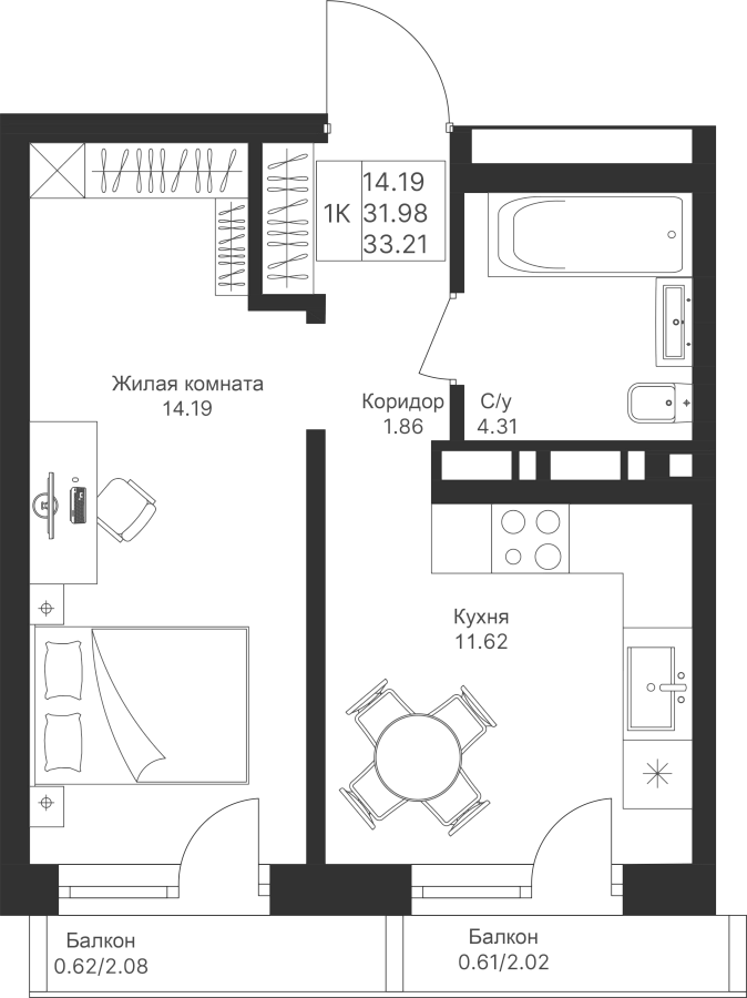 1-к квартира 33.21 м²