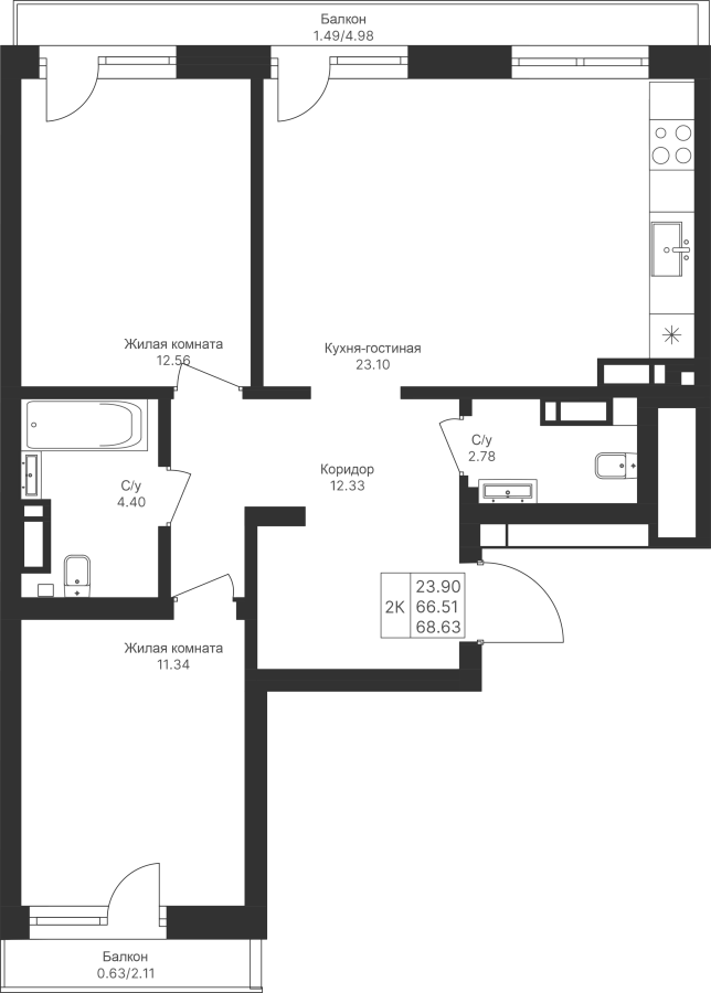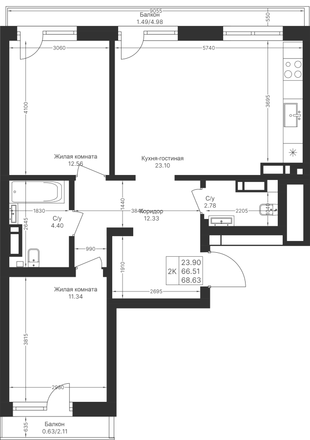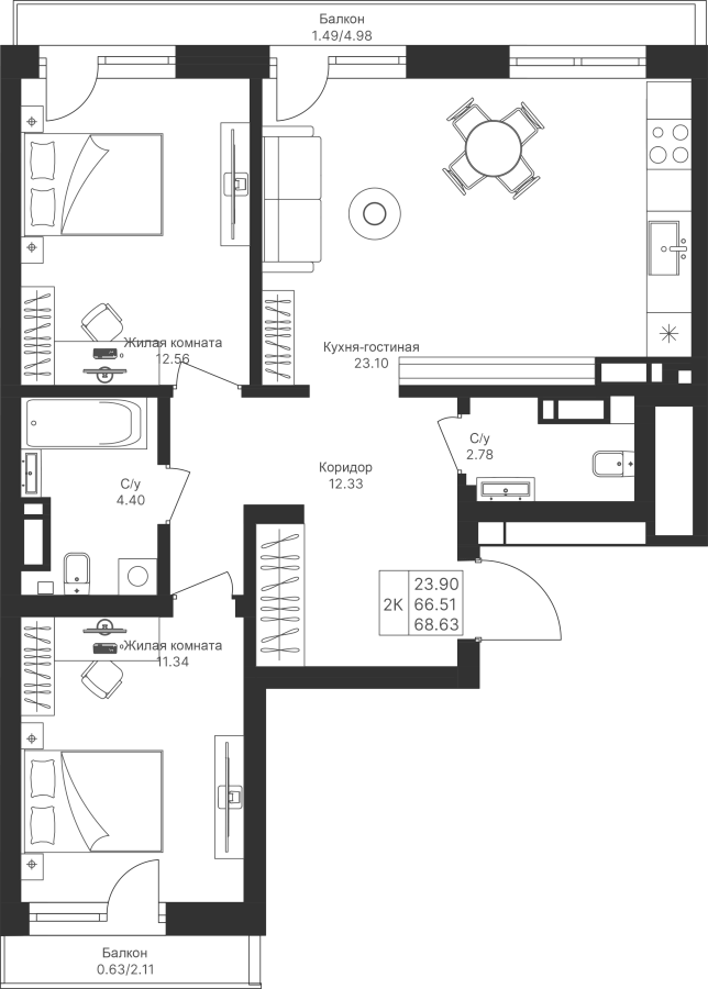 2-к квартира 68.63 м²