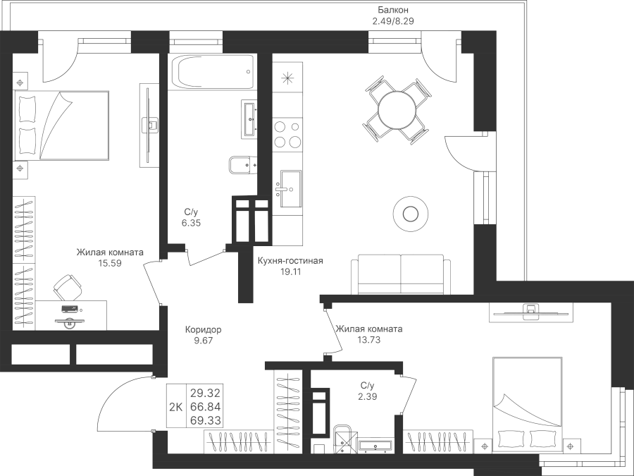 Визуализация и планировка, в том числе в части площади и размера стен жилого помещения, являются проектными и могут быть изменены в ходе строительства объекта. Цена квартиры зависит от выбранной программы и акции, актуальные цены можно уточнить у менеджеров и на момент заключения договора.