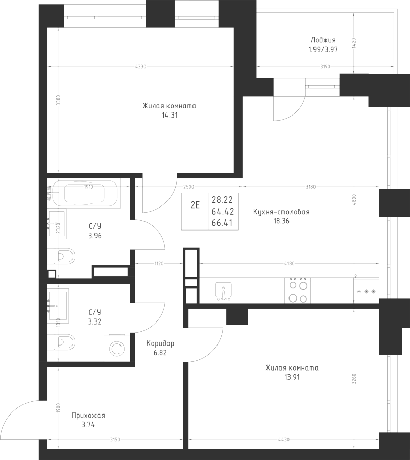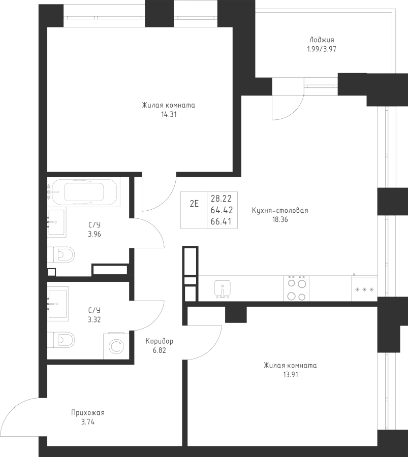 2-к квартира 66.41 м²