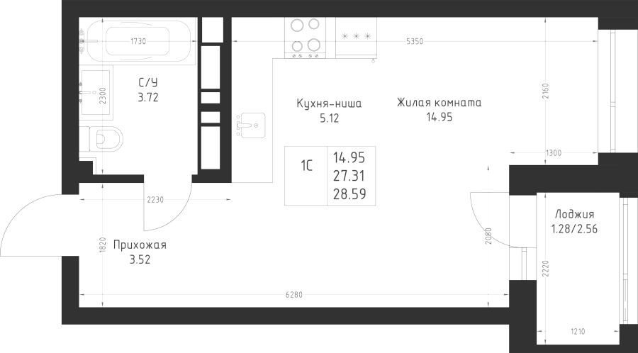 Студия 28.59 м²