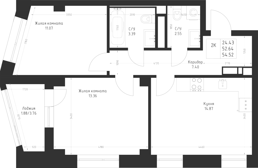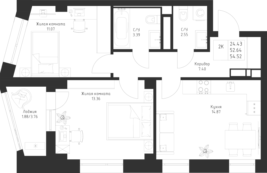2-к квартира 54.52 м²