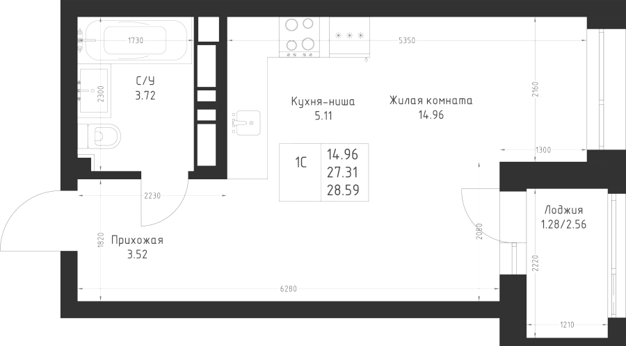 Студия 28.59 м²