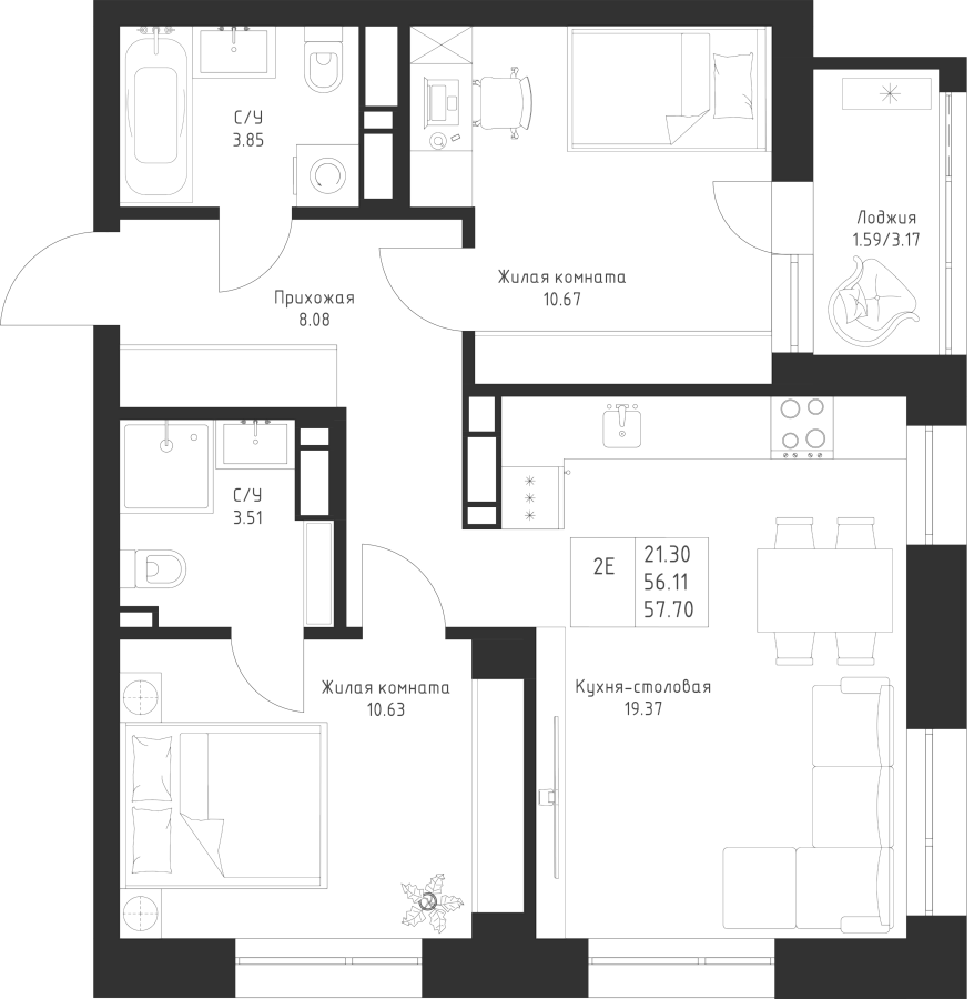 2-к квартира 57.7 м²