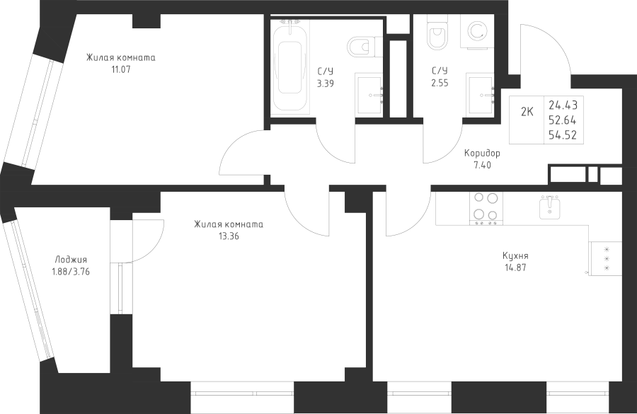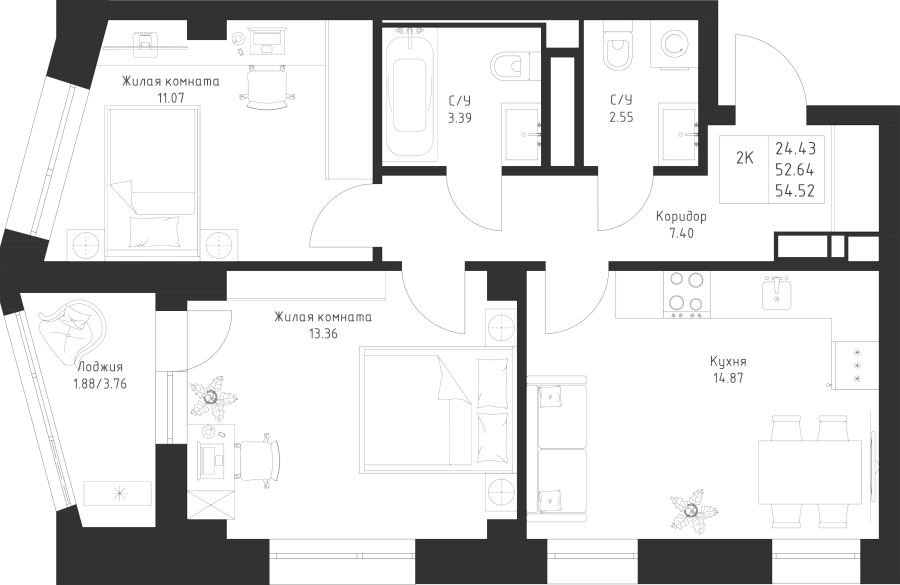 2-к квартира 54.52 м²