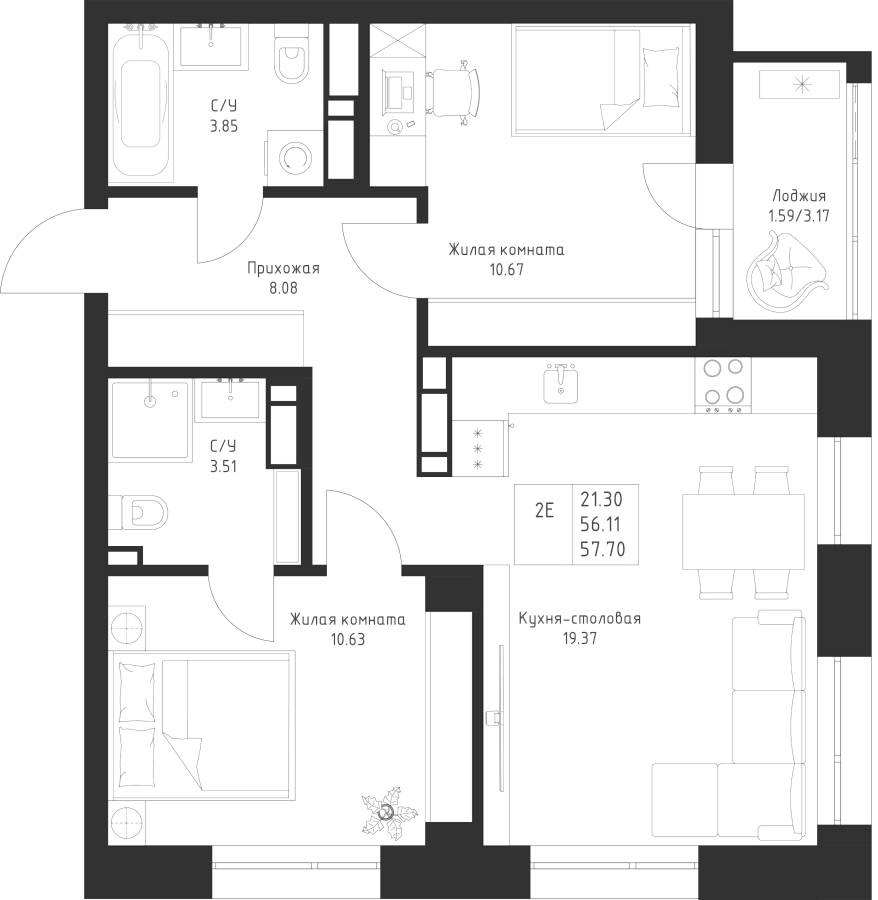 2-к квартира 57.7 м²