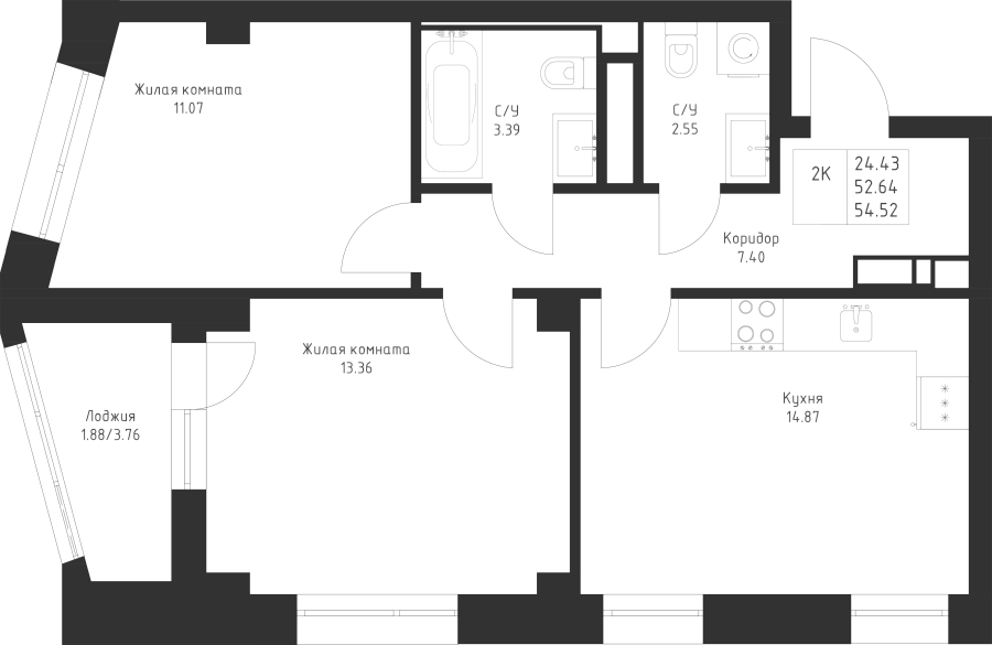 2-к квартира 54.52 м²