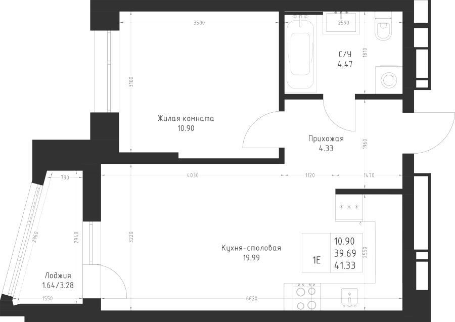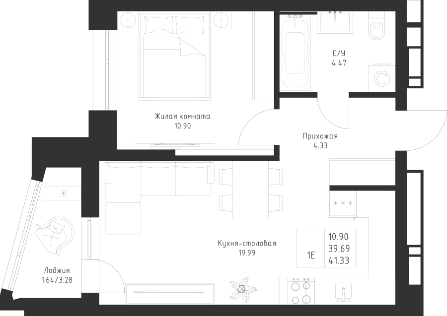 1-к квартира 41.33 м²