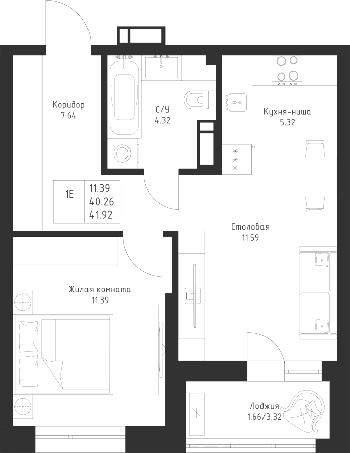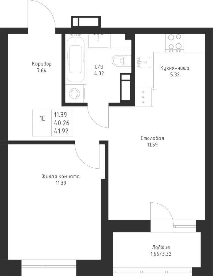 1-к квартира 41.92 м²