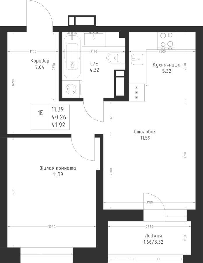 1-к квартира 41.92 м²