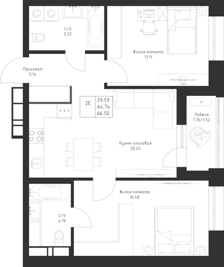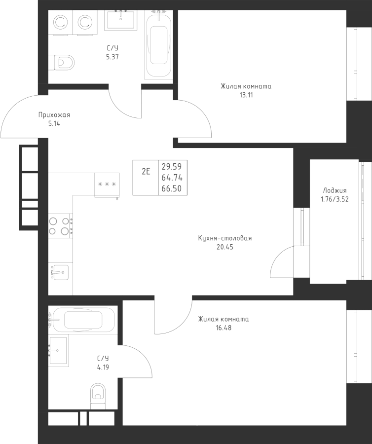 2-к квартира 66.5 м²