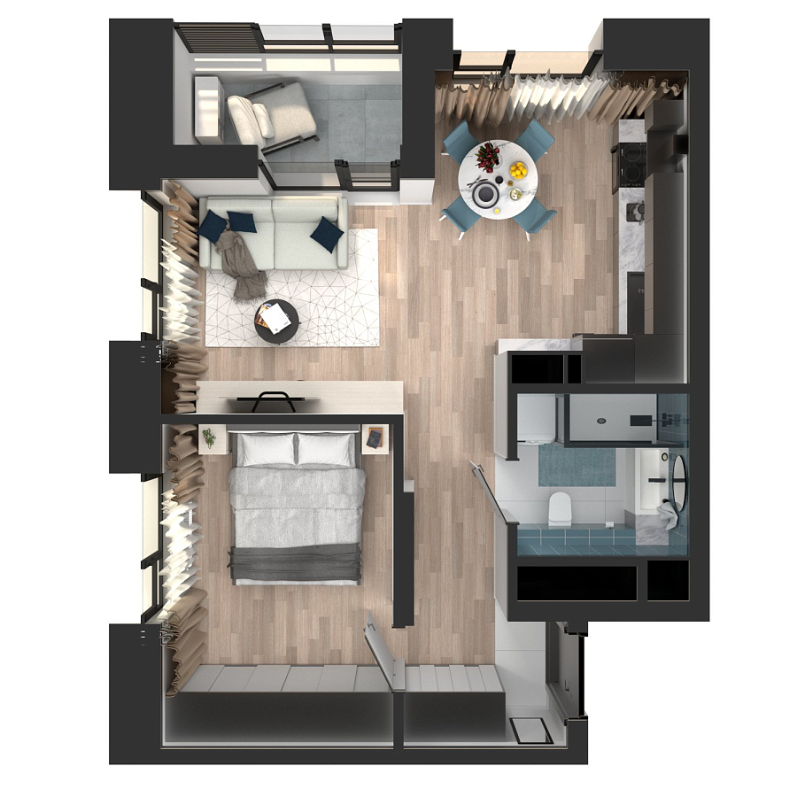 Визуализация и планировка, в том числе в части площади и размера стен жилого помещения, являются проектными и могут быть изменены в ходе строительства объекта. Цена квартиры зависит от выбранной программы и акции, актуальные цены можно уточнить у менеджеров и на момент заключения договора.