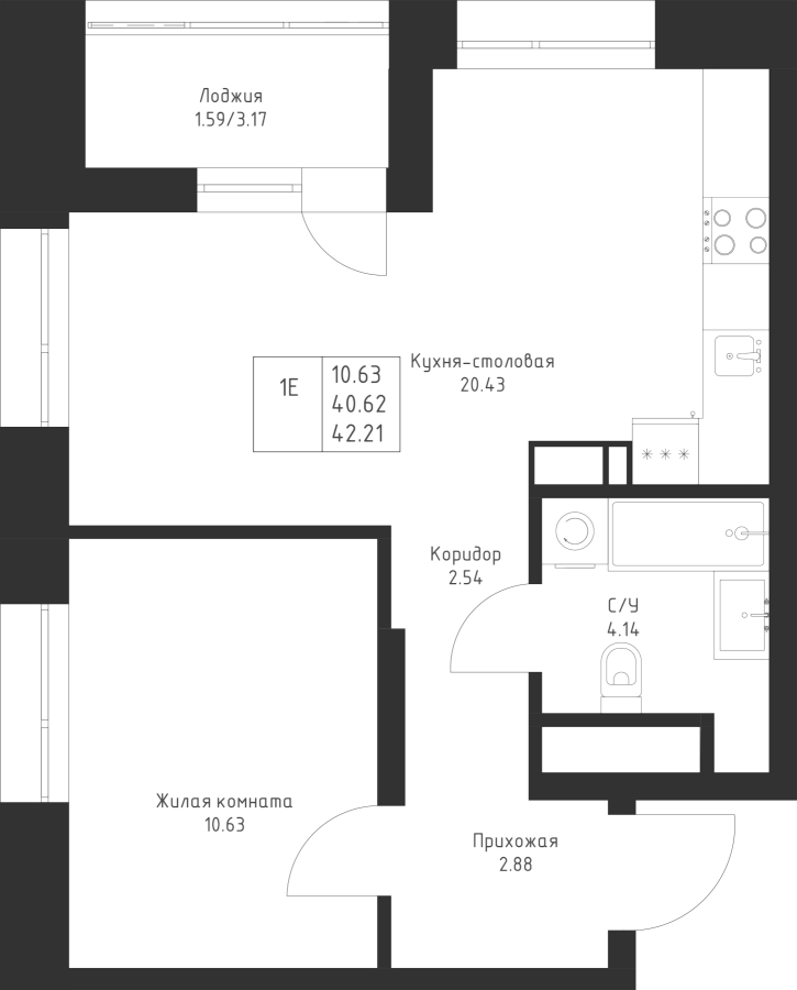 1-к квартира 42.21 м²