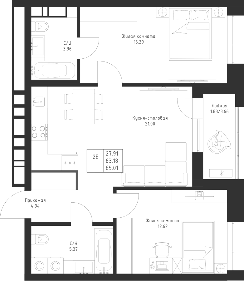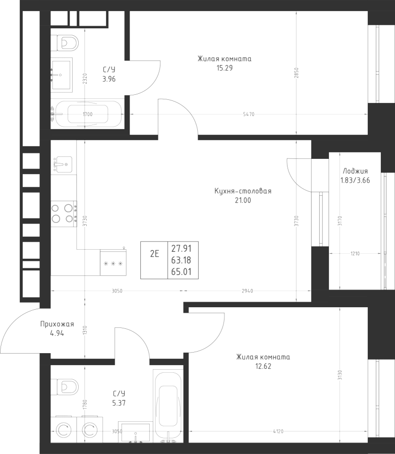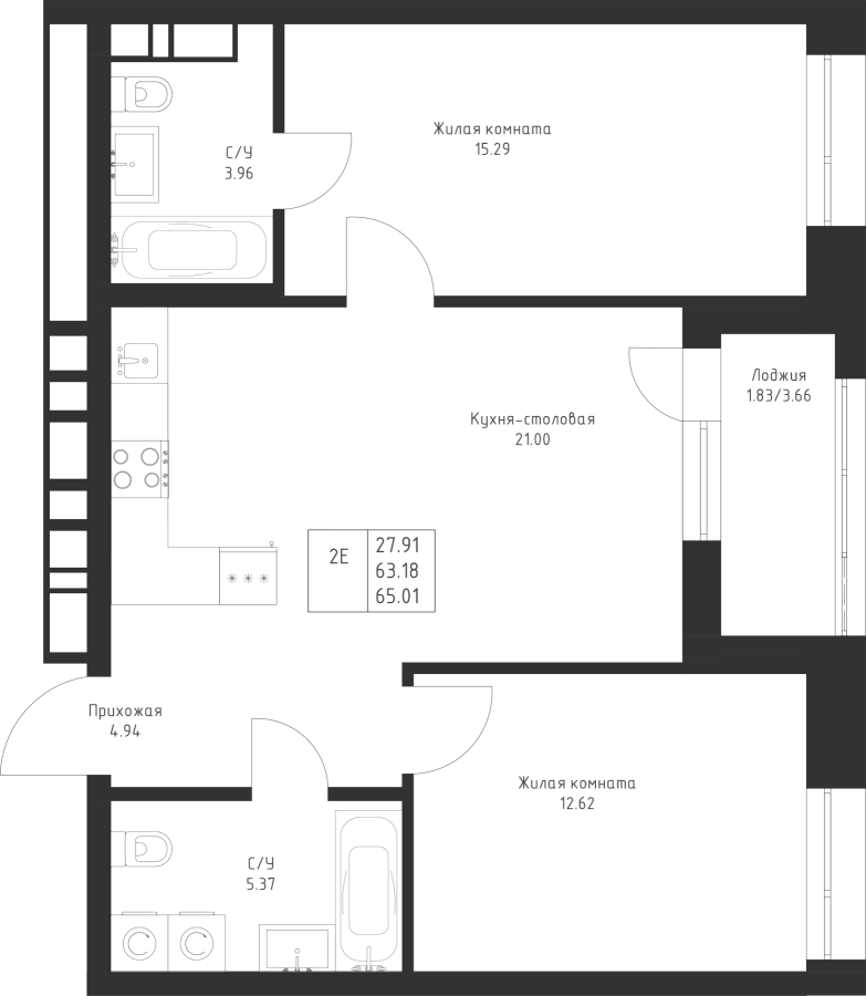 2-к квартира 65.01 м²