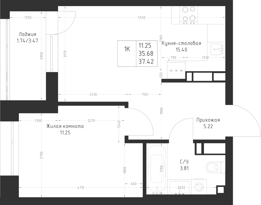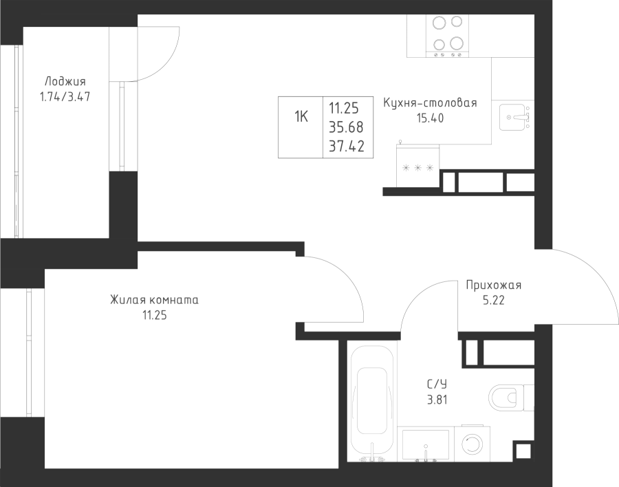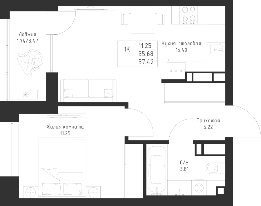 1-к квартира 37.42 м²