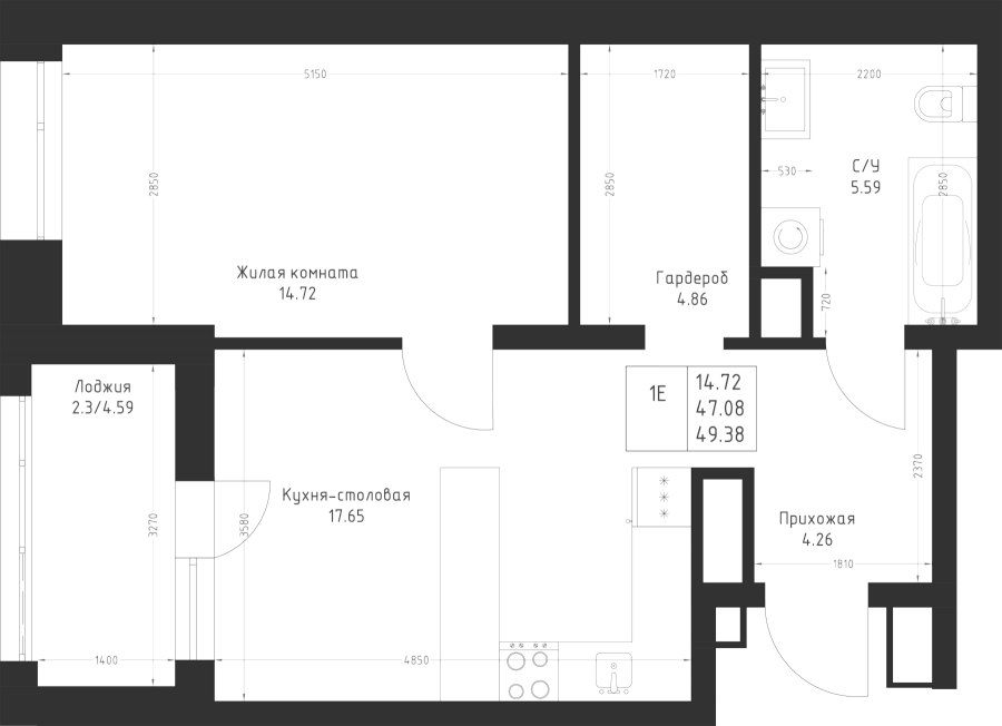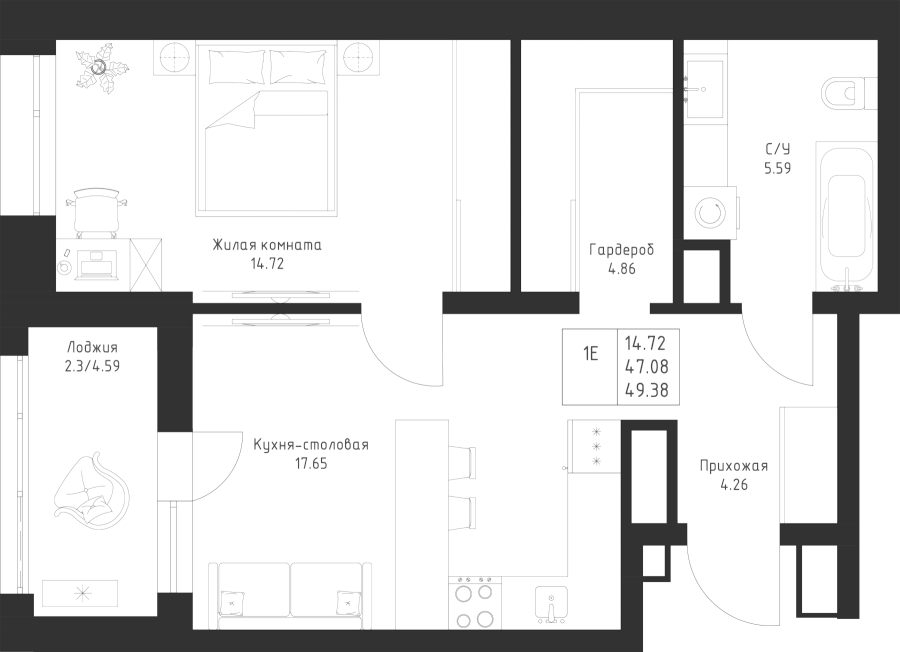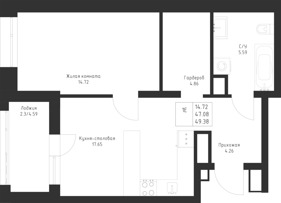 1-к квартира 49.38 м²