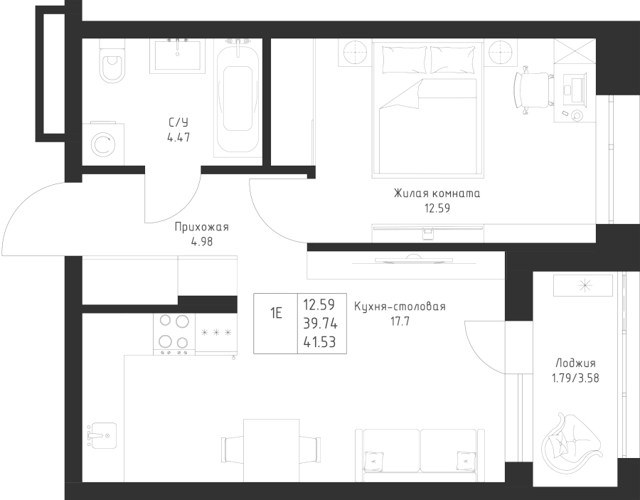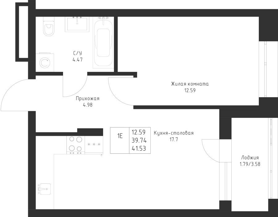 1-к квартира 41.53 м²