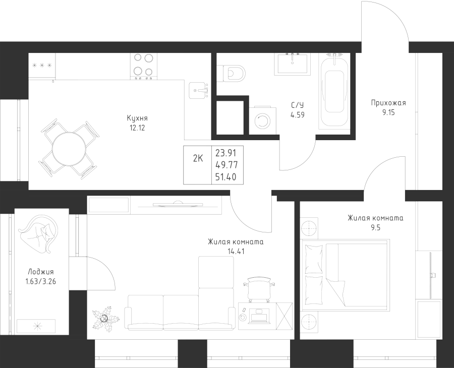 2-к квартира 51.4 м²
