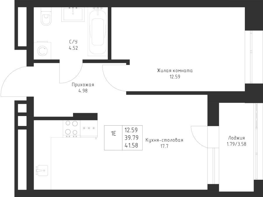 1-к квартира 41.58 м²