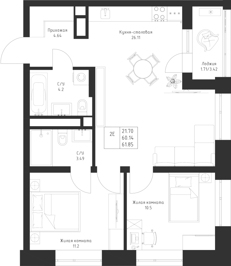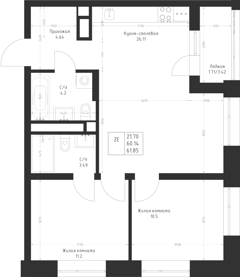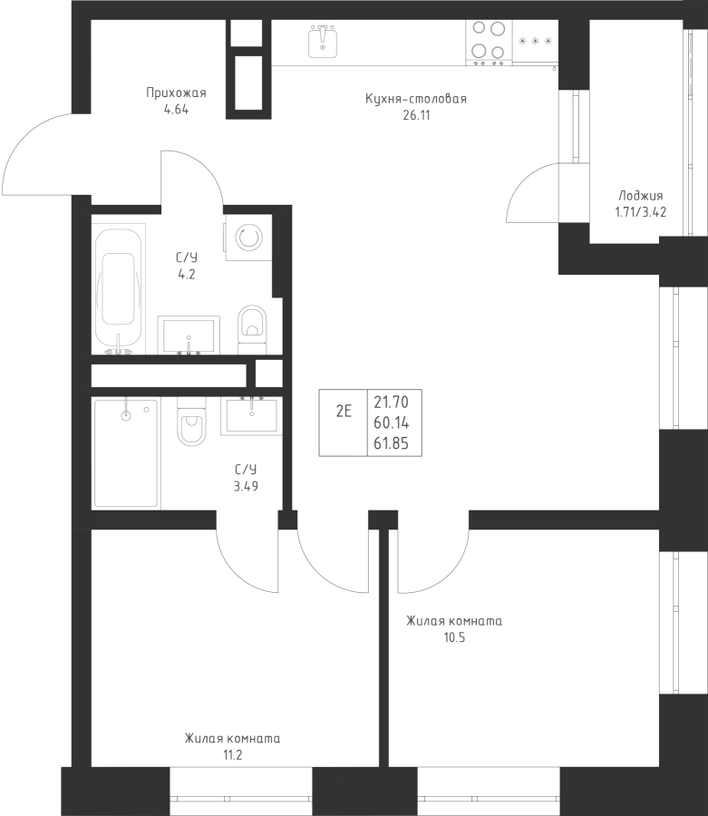 2-к квартира 61.85 м²