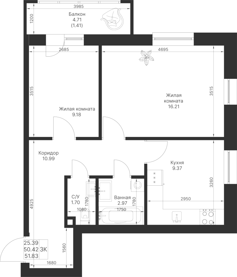 2-к квартира 51.83 м²