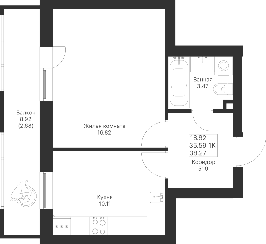 1-к квартира 38.27 м²