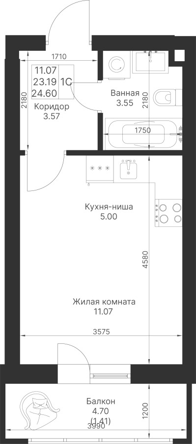 Студия 24.6 м²