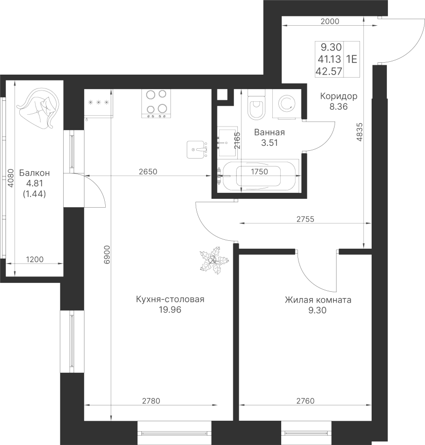 1-к квартира 42.57 м²