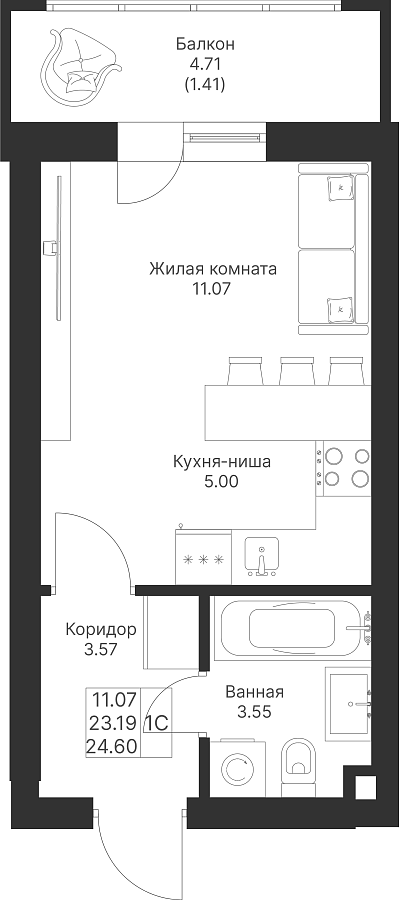 Студия 24.6 м²