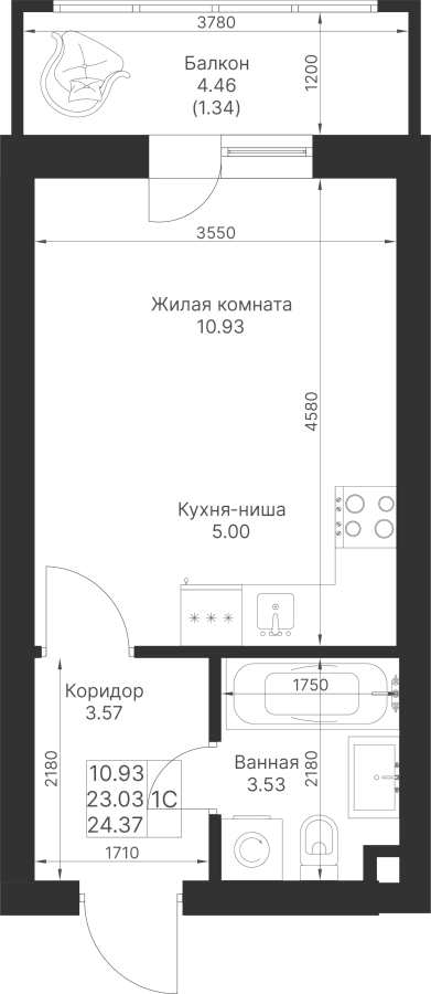 Студия 24.37 м²