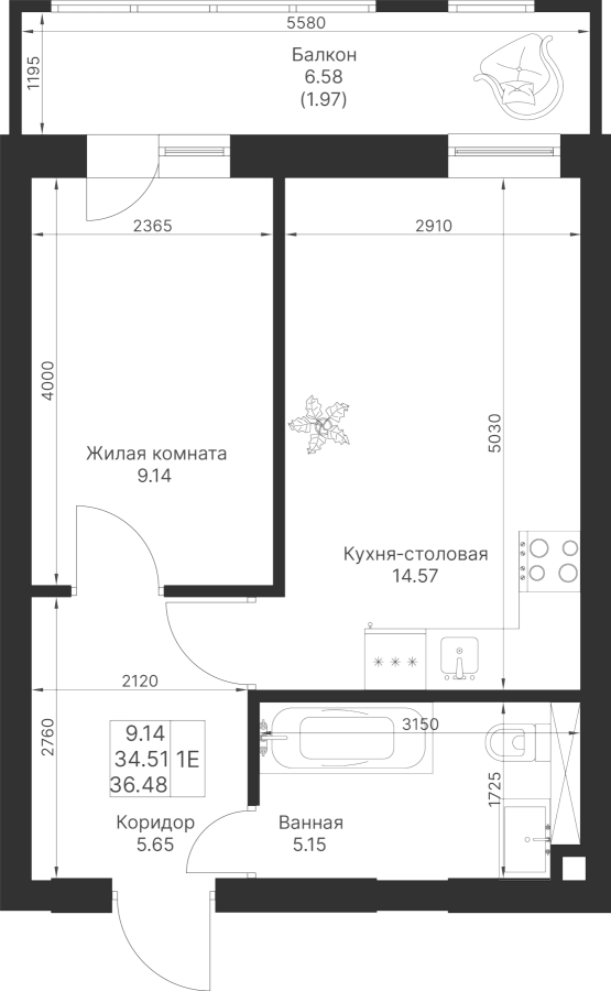 1-к квартира 36.48 м²