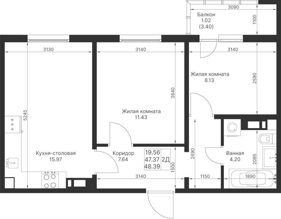 2-к квартира 48.39 м²