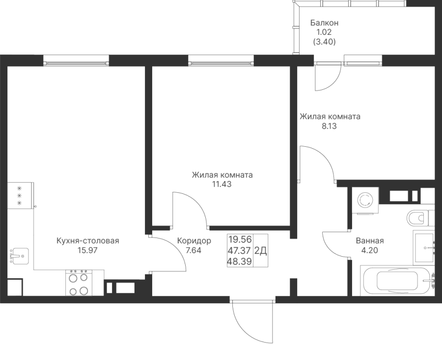 2-к квартира 48.39 м²