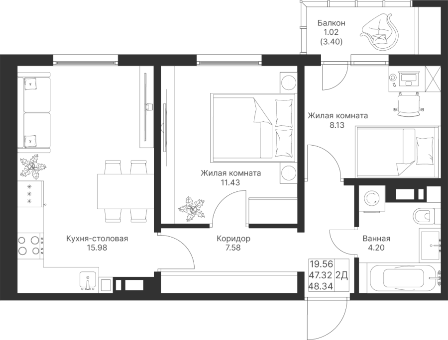 2-к квартира 48.34 м²