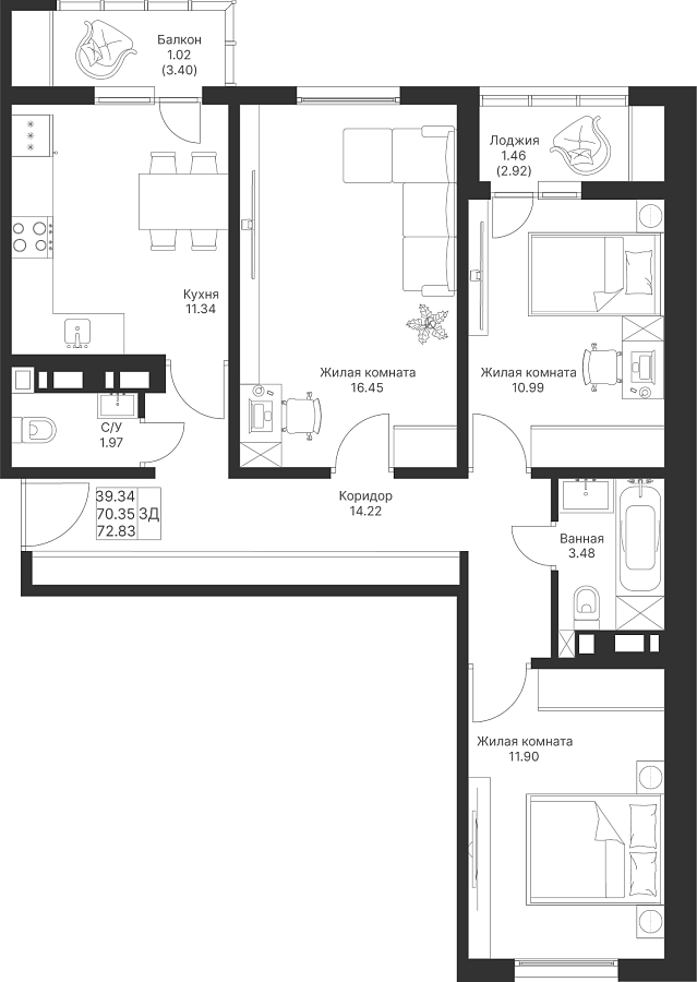 3-к квартира 72.83 м²
